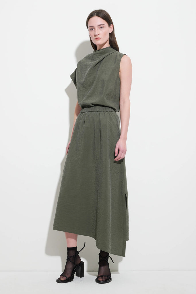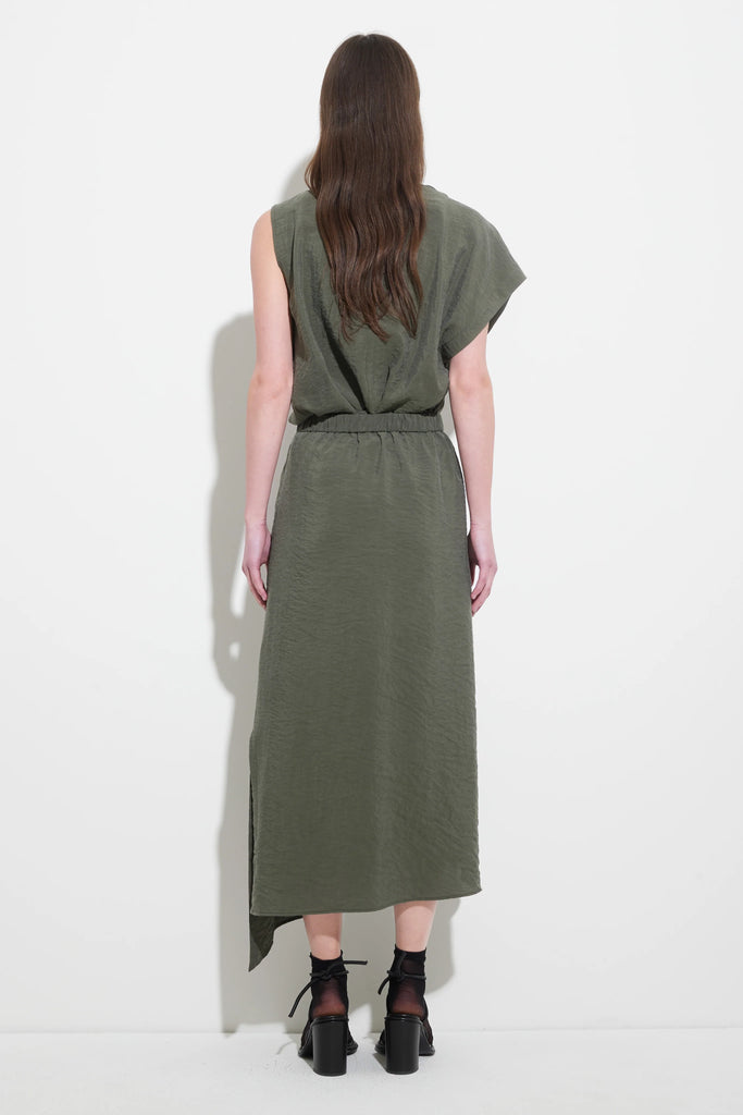 De SOBAT rok van Christian Wijnants is een midi-rok met een zachte structuur en moderne asymmetrische zoom. Gemaakt van lichtgewicht, gekreukte stof in een gewassen thyme-groene tint met subtiele glans. De elastische tailleband zorgt voor comfort, terwijl de losvallende pasvorm en verfijnde textuur de rok perfect maken voor moeiteloze, elegante looks.