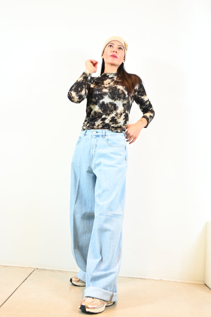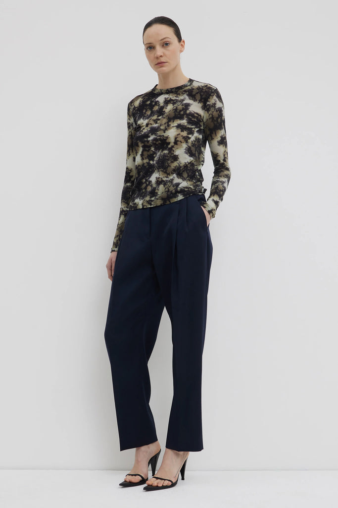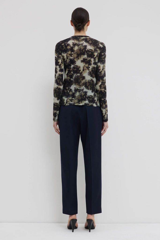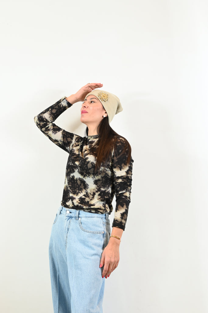 De TAMPIONE top van Christian Wijnants is een lichtgewicht jersey longsleeve met een zachte wolmix die warmte en stretch combineert. De slanke pasvorm valt soepel over het lichaam. De in-house ontwikkelde Raisin Jasper print geeft de top een gemarmerd effect met aardse bruintinten, olijfgroen en ivoor. Comfortabel én artistiek.