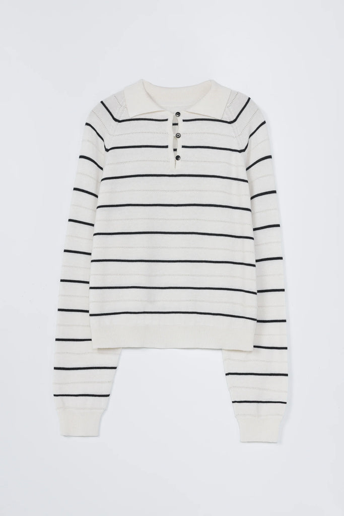 De witte basis wordt verrijkt met een fijn zwart streeppatroon, subtiel onderbroken door getextureerde biezen die zorgen voor een elegant contrast. De kraag is afgewerkt met drie kleine knopen, wat zorgt voor een minimalistisch detail dat het ontwerp compleet maakt.
