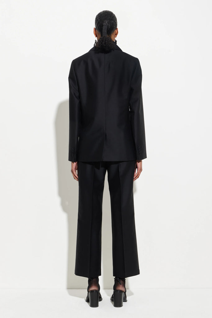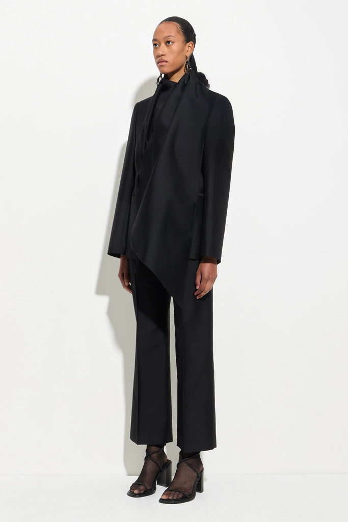 Getailleerd jasje van een elegante stof met een strakke, kraagloze halslijn en een recht, gestructureerd silhouet. Het ontwerp heeft een afneembaar sjaalpaneel dat netjes in de nek kan worden dichtgeknoopt, voor extra gelaagdheid of om zonder te dragen voor een minimalistische look. Een geïntegreerde riem aan de zijkant accentueert de taille subtiel. Afgewerkt met discrete steekzakken.