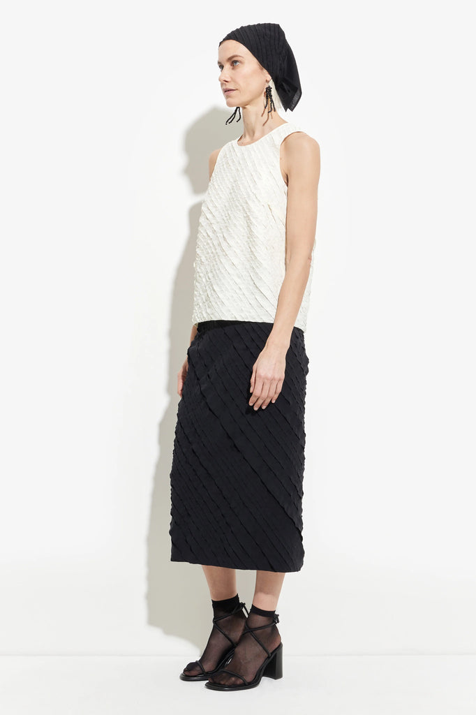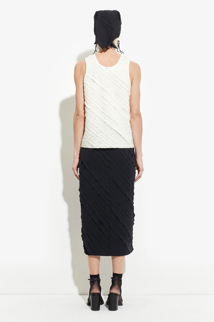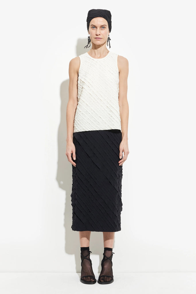 Een studie in textuur en ingetogenheid. Deze mouwloze top is gemaakt van dubbelzijdige stof, afgewerkt met handgemaakte diagonale snijlijnen. Elke snede is schuin aangebracht, waardoor een sculpturaal oppervlak ontstaat dat zowel organisch als weloverwogen aanvoelt. Het silhouet is strak en getailleerd vanaf de schouders, recht vallend aan de zoom. Minimalistisch van veraf, rijk gedetailleerd van dichtbij.