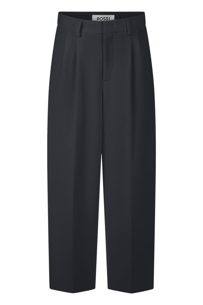 De geplooide broek van Rossi in donkerblauw combineert een elegante uitstraling met een moderne pasvorm. Het high-waist model accentueert het silhouet, terwijl de licht O-vormige, cropped pijpen zorgen voor een eigentijdse twist. Dankzij de verstelbare tailleband sluit de broek perfect aan en biedt hij optimaal comfort. De Franse steekzakken en de paspelzak achteraan geven dit stijlvolle ontwerp een verfijnde afwerking. Perfect voor zowel een zakelijke als casual look.